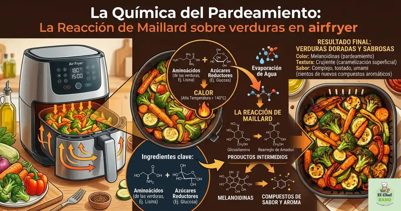 Para entender por qué las verduras en airfryer saben mejor que las hervidas, debemos hablar de química culinaria. La Reacción de Maillard es la responsable de esos tonos dorados y sabores tostados. Ocurre cuando los aminoácidos y los azúcares naturales del vegetal se transforman por el calor seco por encima de los 140°C.